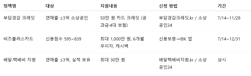 - 신청 사이트: 부담경감크레딧.kr 또는 소상공인24. 별도 증빙서류 불필요, 사업자록번호 입력 후 자동 확인
