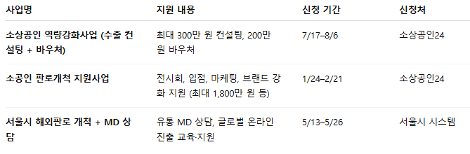 2025년 정부와 지자체는 수출 컨설팅·바우처, 전시회·유통 채널 진출, 글로벌 온라인 플랫폼 입점, MD 상담회 특화 지원 등 다양한 해외시장 진출 지원을 체계적으로 확대하고 있습니다.